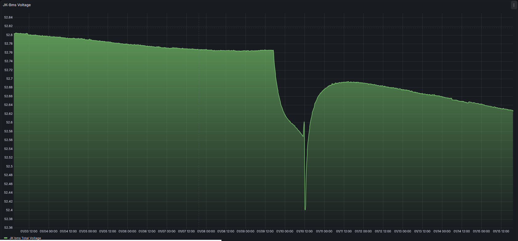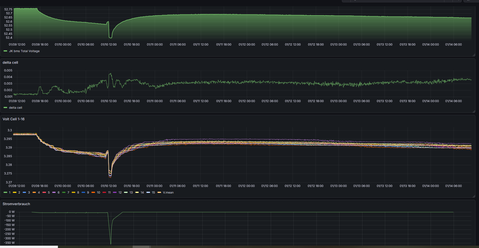 Und eigentlich hätte der AKKU gar nichts mehr machen sollen, da über die Tage ohne Arbeit die Batterien auf 10° abgekühlt sind und das BMS in ERRORS: Charge undertemperatur ging. Restart ist im BMS auf 12°C gestellt die er gestern aber nicht erreichte.